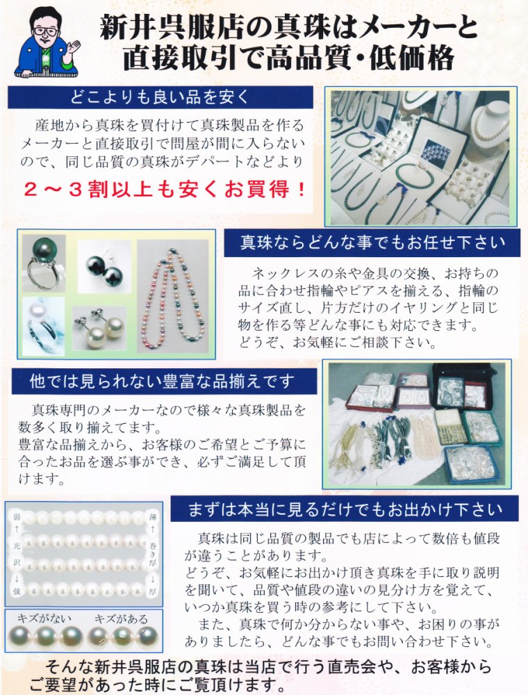 真珠メーカーと直接取引でデパートや宝飾店などより高品質な品を2~3割以上も安くお買求めいただけます