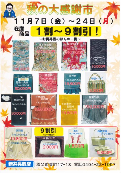 秋の大感謝市開催中 2025年11月16日 最終更新日時 : 2025年11月21日 araigofuku11月7日(金)から24日(月)まで在庫商品を1割~9割引のバーゲンセールを開催しています\ 最新情報をチェック /